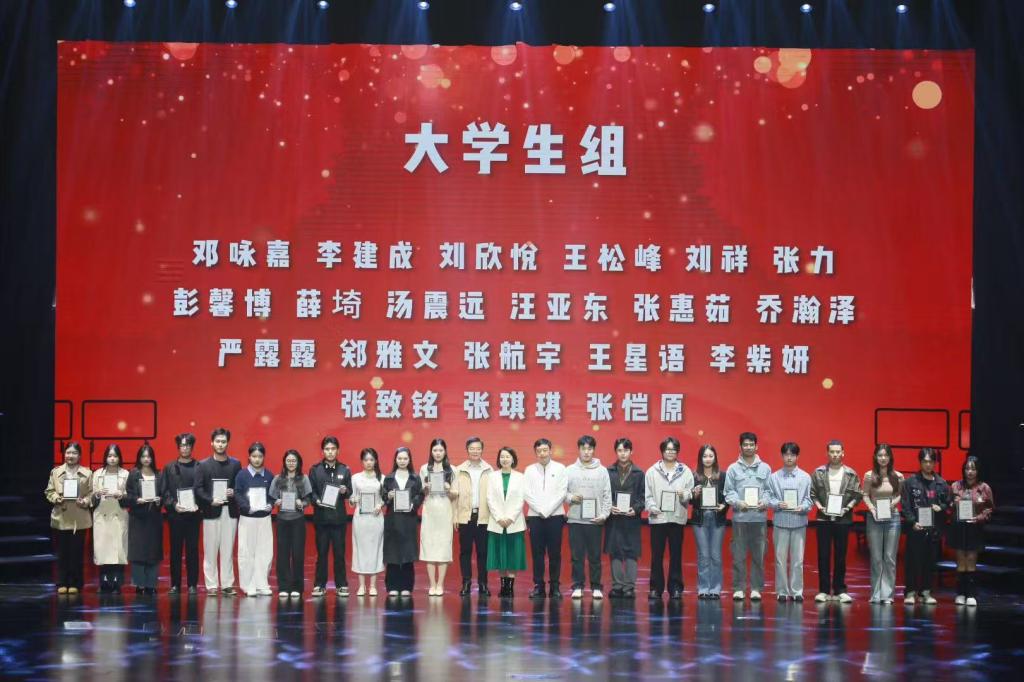 在大学生组竞赛中,我们学子以声为媒、以情传意,展现出扎实的专业功底与深厚的文化素养,汤震远、郑雅文合诵的《相机上的红丝绳》与王星语朗诵的《奶奶的星星》双获金星奖,张赛一朗诵的《播音员》荣获银星奖。其中,《相机上的红丝绳》入选大会优秀作品展演。该作品以战争年代为背景,借“相机红丝绳”意象串联个人情感与家国情怀,通过男女声交替演绎的形式,赢得现场观众广泛认可。